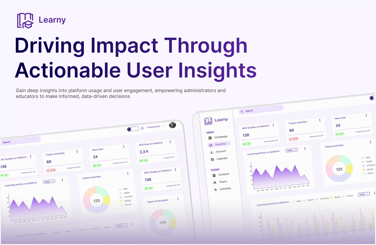 The primary goal of Learny is to provide users with a real-time, data-driven overview of learning behavior, student activity, and performance metrics. From average studies on the platform and tutee engagement, to new user trends and average time spent, every element of the dashboard was intentionally designed to offer clarity, context, and quick comprehension.